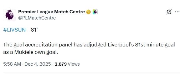 英超官方写道:“进球认证小组判定利物浦第81分钟的进球为穆基勒的乌龙球。”