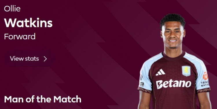 梅开二度助球队逆转,官方:沃特金斯当选维拉4-3布莱顿最佳球员